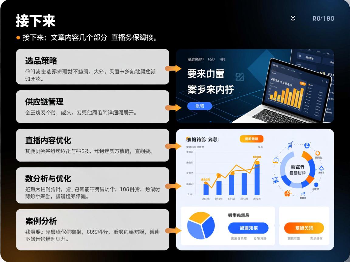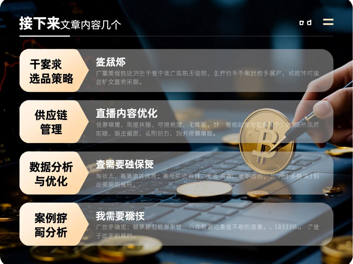 然后是供应链管理,这部分要涵盖选品后的生产、物流和库存管理,可能需要提到ERP系统的使用,以及如何与供应商建立长期合作关系,确保供应链的稳定性和效率,还要考虑如何应对突发情况,比如物流延迟或原材料短缺。 优化部分,我需要讨论如何制作吸引人的直播内容,比如使用TikTok的直播功能、背景音乐、主持人技巧等,还要提到如何通过数据分析来优化直播内容,比如调整视频时长、互动方式等。